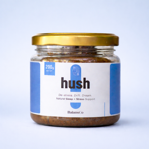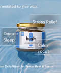 Hush is an Ayurvedic, plant-based blend crafted to reduce your cortisol level and help you fall asleep faster, stay asleep longer, and wake up refreshed — without dependency or grogginess.